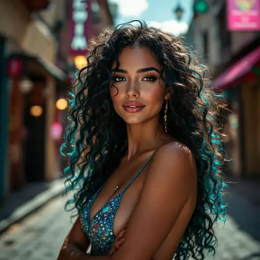 In the heart of an enchanted forest, Snow White stands as a mystical nymph, her presence radiating an ethereal beauty. Her skin is as pure and white as freshly fallen snow, flawless and luminous, reflecting the magic of the realm she inhabits. Her hair, as black as a raven's wing, cascades down her back in gentle waves, framing her delicate face and accentuating her striking features. Her body is slender and graceful, with a gentle curve to her hips and a slender waist, embodying the elegance and poise of a true forest nymph. She is adorned in a meticulously crafted swimsuit, intricately made from an array of vibrant leaves and blossoming flowers. The leaves, in various shades of green, are interwoven to form a pattern that hugs her figure, while the flowers, in hues of pink, red, and white, add a touch of softness and femininity. The swimsuit features a cut-out design, revealing glimpses of her snow-white skin and adding an element of allure to her enchanting appearance. Snow White stands by a mystical pool, its waters crystal clear and shimmering with an otherworldly glow. The pool is nestled amidst a lush landscape, surrounded by an abundance of verdant foliage and vibrant blossoms. The trees tower above, their leaves forming a canopy that filters the sunlight, casting dappled shadows on the forest floor. The air is filled with the sweet scent of flowers and the gentle hum of nature, creating a serene and tranquil atmosphere. In this magical setting, Snow White, with her pure snow-white skin and enchanting attire, stands as a vision of beauty and grace, a true embodiment of the mystical nymph she has become.