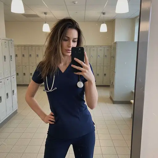 Photo of a woman taking a selfie in a mirror, in natural lighting. --ar 63:128 --stylize 750 --v 6. 1 An iphone camera selfie quality picture, with full rendered background details and no focus blurring, no depth of field, realistic phone camera selfie quality. A woman in a form-fitting dark navy blue nurse scrub suit that has no drawstrings on her pants, with a stethoscope hanging down the back of her neck, full body, her hand on her hip, exuding confidence and sex appeal. The woman has long tousled dirty brown-blond hair with darker roots and subtle lighter highlights, particularly around the face and throughout the lengths. (The hair roots appear natural black), blending into lighter brown at mid hair length and then gradually into faded brown blonde tones, her body figure is toned, slim, and sexy with slightly larger breasts size, ((her arms and hands are slim, slender, and feminine)). The setting is a modern hospital locker room with light beige/cream colored floor and locker cabinets. The image is iPhone 16 camera quality, focusing on the curves of the scrub suit and her figure, but also with enough detail to render the room, the accessories, and the skin tones realistically. The woman is looking at herself in the phone while taking a picture of herself through a mirror, with one hand holding a black iPhone 16 to take a picture of herself. The lighting in the image is well-distributed, with no blurry background. Include a few pendant-style lights hanging from the ceiling in the background. The mirror frame should be slightly visible to show the photo is a reflection from the mirror. Ensure that the hand proportions are slim, feminine and slender and directions are correct and natural.