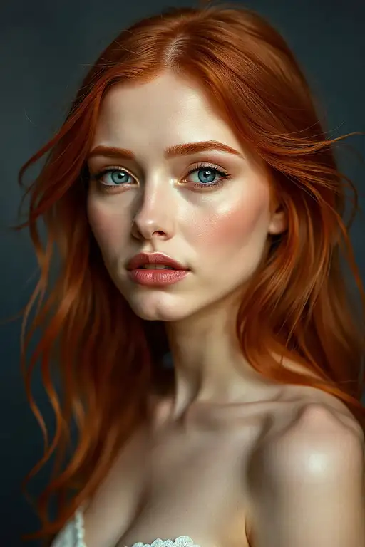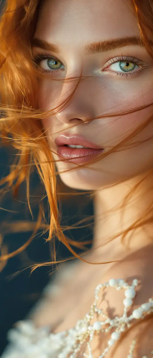 4 days ago "Image is a vintage-inspired high resolution close up head and shoulders portrait of a lithe redhead supermodel, early 20s, with long windswept fiery hair, porcelain skin, emerald green eyes, and parted pink lips. Vertical composition, Rembrandt lighting, sepia undertones, deep blue backdrop, soft golden hour light, dreamy atmosphere, pastel colours, gentle and soothing, hazy, fashion editorial style." PY2K66 PRO 2 17