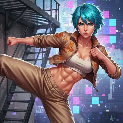 6 days ago 24-year-old European girl, Niji anime style, very sensual look, very hot girl, beautiful charismatic girl, really hot photo, capelli castani, athletic body, a wonderful figure, abs, toned, belly button piercing in the shape of a star with a diamond, full-length photo, athletic woman in her mid-twenties with a short, neon blue pointed haircut, soft and visible ribs, flat and toned stomach, small breasts, short light brown autumn jacket, low-waisted sand-colored trousers, dynamic martial arts kick pose, direct gaze at the viewer, half-length shot, background of an urban fire escape, loading screen of the digital world with a pixelated background, in the style of Jessica Drossin, life-size figures ac417c96de7 0 9