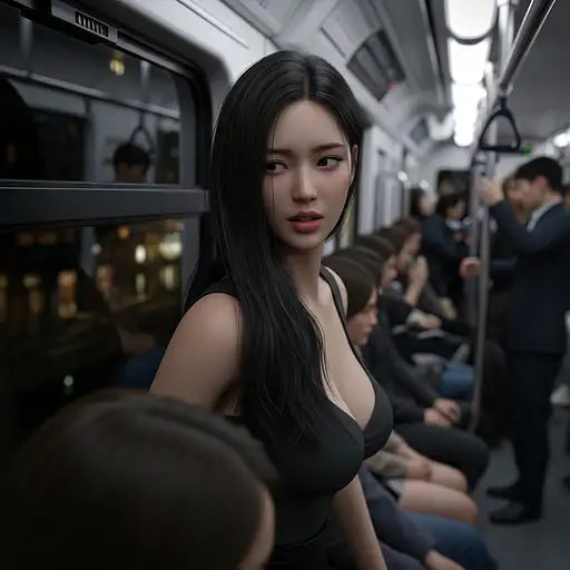 This striking, atmospheric photograph captures a young korean woman in a moment of contemplation, seemingly inside a train or subway car at night. The Subject: The central figure is a woman with curly blonde hair, styled in a slightly tousled updo with some strands framing her face. She wears thin, round-rimmed glasses and has noticeable red lipstick. Her attire is a vibrant, canary yellow, strapless, bodycon mini-dress that hugs her figure, accentuating her curves. She is posed in profile to the viewer but with her upper body turned slightly towards the window she leans against. Her hands are delicately placed on the window frame or the wall beside it. Her expression is pensive as she gazes out the window. The Setting & Lighting: The setting is dimly lit, characteristic of a train car at night or in an underground station. Strong, warm light, likely from outside the train (perhaps platform lights), illuminates her from the left, casting highlights on her skin, hair, and the yellow dress, while the other side of her body and parts of the train interior are in shadow. This creates a dramatic, chiaroscuro effect. Through the window and in the background, blurred, out-of-focus lights (bokeh) in various colors (primarily warm yellows, oranges, and reds, with some blues) suggest an urban environment or a station platform. Reflections of the interior lights and the woman herself are subtly visible in the window glass. The metallic sheen of the train's window frames and walls catches the light, adding to the urban, industrial feel. Composition & Mood: The composition is a vertical portrait, focusing tightly on the woman. The strong vertical lines of the window frames contrast with the soft curves of her body and hair. The shallow depth of field keeps the woman in sharp focus while blurring the background, drawing the viewer's attention directly to her and her reflective mood. The overall mood is intimate, slightly mysterious, and cinematic. The warm lighting and the woman's thoughtful gaze evoke a sense of narrative, as if she's caught in a private moment amidst the public transience of a train journey.