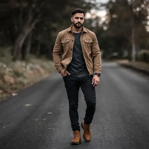full body (from feet to head) of a 19-year-old Latina woman with porcelain white skin and wavy chestnut blond hair. She has an eyecatching face with soft features, looking directly at the camera with a confident and flirtatious expression, and a captivating, charming smile. She is wearing a short suede leather jacket only, slightly open at the front, tight denim jeans, high heels leather boots, adding a touch of boldness to her look. She is stand and tying up her hair trying to do a pony tail, bitting a pencil in the mouth. The lighting is soft and flattering, enhancing her porcelain skin and the contours of her face and eyes. Her hair flows naturally around her shoulders. Background is subtly blurred to focus entirely on her. Ultra-detailed, realistic skin texture, with cinematic portrait composition and sharp focus on the eyes and smile, she is in the middle of a college coffee