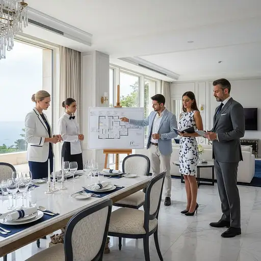 1 day ago *"Inside a luxury villa with panoramic windows and refined interior design. The PC Consulting team is training household staff: An elegant woman in her 30s (white & navy outfit) is demonstrating 5⭐ hospitality standards to a butler and a maid (how to set a luxury table). A distinguished man in his 40s (tailored suit) is observing and taking notes on a digital tablet (audit role). A young professional man (casual-chic, blazer) is explaining operational flow on a printed plan. A stylish woman in her late 20s (smart dress, notebook in hand) is guiding staff on service etiquette. Atmosphere: professional yet warm, premium hospitality training, luxury lifestyle aesthetic, editorial photography style, white & blue PC Consulting palette."* Paddysss 0 3