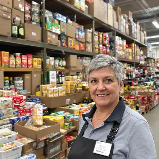 8 months ago In the photo, a woman of about fifty, gray-haired with a short haircut, the head of a department in a grocery store, looks at the camera and stands in a huge trading floor, in front of a mountain of goods standing in the corner up to the ceiling, consisting of boxes with goods: fish, bottles, pasta, cereals, alcohol and so on fbfd3f4cf23 0 30
