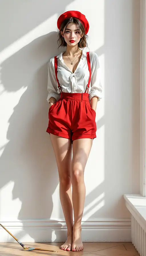 The image shows a woman with long, dark hair elegantly posed on a light-colored sofa in a minimalist room. The scene is illuminated by strong, direct sunlight coming from the right, which creates prominent shadows across the floor and furniture. Center: The woman is the central subject, positioned on the right-hand side of the sofa as viewed by the observer. Her body is angled toward the left, while her head is turned to face the camera directly. Foreground: In the bottom-left corner, there is a portion of a brown, textured rug. The rest of the foreground consists of a light-colored floor with long, dark shadows cast diagonally from right to left. Background: Behind the woman and the sofa, there is a plain, light-colored wall. Set into the wall are two recessed rectangular shelves, one above the other. Each shelf holds a single, light-colored vase. To the far left, a double electrical socket is visible on the wall. The Woman: She is wearing a form-fitting, black, long-sleeved dress with a square neckline that ends around her knees. Her legs are crossed, and she is wearing black, pointed-toe high heels with thin ankle straps fastened by small gold buckles. She is accessorized with gold-colored hoop earrings. One arm is bent with her hand behind her head, and the other arm rests on the back of the sofa. Her hair is dark, long, and straight, and she is looking directly at the camera with a neutral expression. The Sofa: The sofa is a modern design, upholstered in a light beige or off-white textured fabric. It features clean lines, square arms, and is supported by slender, cylindrical chrome legs. The Room: The room has a minimalist aesthetic. The walls and floor appear to be a smooth, matte, off-white or very light beige color. The two vases in the wall niches are a similar light, neutral color with a matte finish. Lighting: The lighting is high-contrast, indicating a strong light source like the sun is entering from a window or opening on the right side of the scene. This creates sharp, well-defined shadows of the window frame on the floor and sofa.