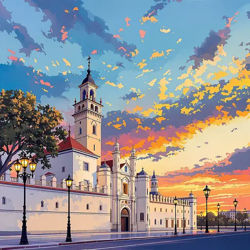 8 months ago oil painting in the style of palette knife technique of the Alcázar Palace in Madrid, with its bell tower at sunset, street lamps on the sidewalk, wide shot showing all three buildings of the palace with a clear sky and sunset --ar 3:4 --stylize 750 NorthmoorAI 2 140