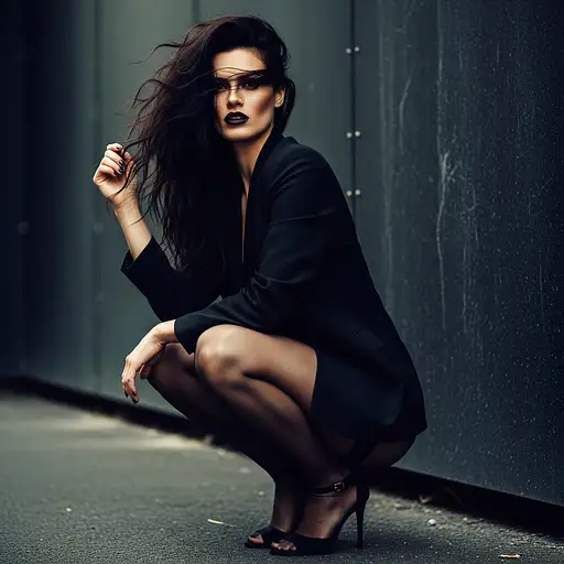 4 days ago High-fashion, gritty portrait of a powerful woman squatting outdoors against a dark, textured wall. She has long, dark, windswept hair, an intense gaze, and bold dark lipstick. She wears an open black blazer, sheer black tights, and open-toe dark heels. Moody, dramatic lighting. Shot on film, medium-long shot. Cinematic, noir style. aivisionspace 0 17