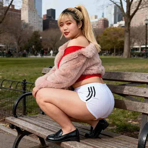 A young woman stands alone amidst the quiet beauty of a winter wonderland, her presence radiating an air of confident sensuality despite the serene atmosphere. Her bright blue eyes seem to sparkle with a hint of mischief, as if she's privy to some private joke that only she can see. Her raven-black hair cascades down her back like a waterfall of night, accentuating the delicate features of her face and drawing attention to the vibrant colors of her outfit. An open fur coat drapes elegantly around her torso, its softness seeming to contrast with the rugged texture of her muscular midriff. A ribbed dark yellow crop top adds a pop of color to this otherwise muted scene, creating an unexpected juxtaposition that's both captivating and intriguing. A pair of black pants hugs her legs, their sleek surface seeming to reflect the faint light of the overcast sky. A leather belt cinches at her waist, its rough texture adding a touch of ruggedness to her overall appearance. Her hands are tucked deep within the pockets of her coat, as if she's trying to keep some secret hidden from prying eyes. The dense forest that surrounds her seems to be shrouded in a thick layer of fog, creating an atmosphere that's at once mysterious and alluring. The falling snowflakes dance around her like tiny ballerinas, adding a touch of ethereal beauty to this already captivating scene. Every aspect of this photograph is bathed in muted colors, as if the very essence of winter has been distilled into this one, perfect moment.