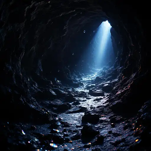 4 months ago photographic, ultrarealistic, ubsurdres, a pitch black cavern, with crystals like teardrops in mid air reflecting the single gleam of a distant light , giving off rainbow camera lens mudshark PRO 0 13