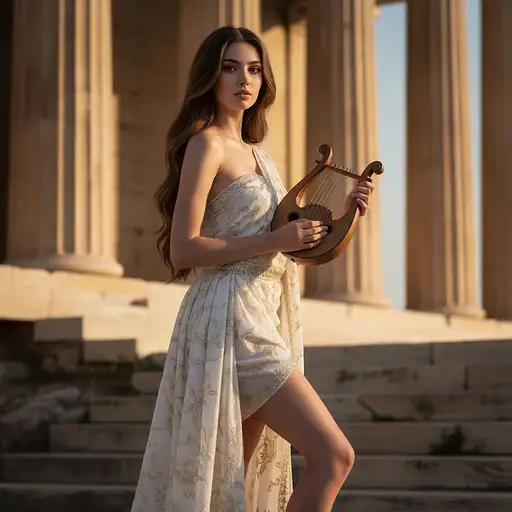 A breathtaking digital depiction of a Greece-inspired female figure exuding timeless elegance and wisdom. She stands in a dynamic, graceful pose on the sunlit steps of the Acropolis, surrounded by towering marble columns bathed in golden light. Her long, silver hair cascades in soft waves, framing a delicate face with striking blue eyes that radiate serenity, while her curvaceous, athletic body is accentuated by a flowing white chiton embroidered with shimmering gold patterns. In one hand she holds a lyre, poised to play, as the warm sunlight highlights the intricate textures of her attire and the ancient, weathered stones around her, evoking the harmony and artistry of classical Greece. **Rostro:**