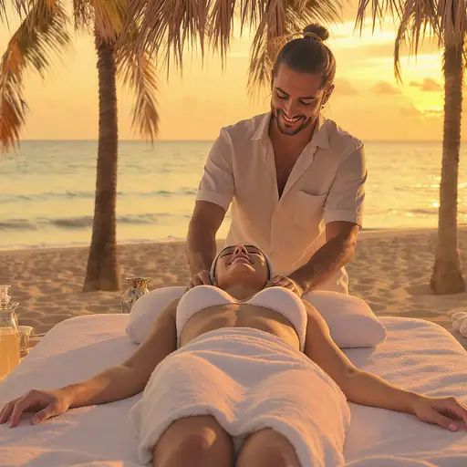 4 months ago A luxurious beach massage scene at sunset. A beautiful woman is lying on her back on a professional beach massage table, fully visible from the front. She is wearing a tasteful, elegant bikini and has a light towel draped over her lower body. A male therapist in stylish beach attire is gently massaging her chest, and collarbone area. Her face is relaxed with a gentle smile, enjoying the treatment. The background shows palm trees, a calm ocean, and a serene beach resort vibe. Lighting is soft and golden, capturing a realistic and cinematic mood. Ultra-realistic, high detail, elegant, summer atmosphere. 4411c670f9e 0 13