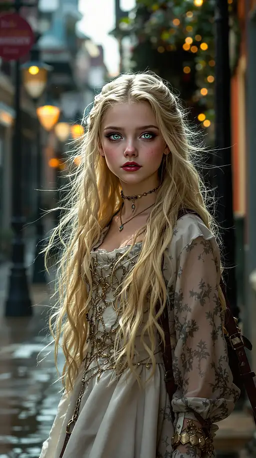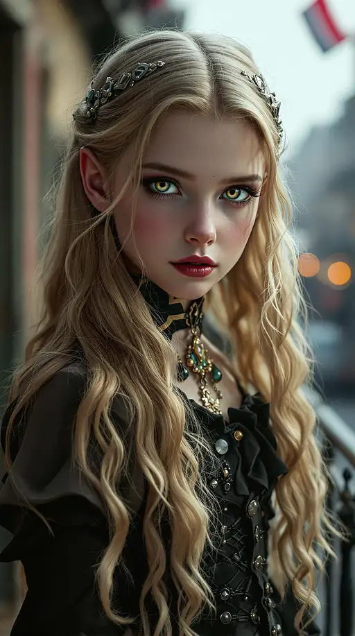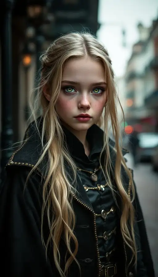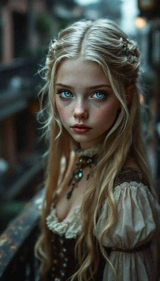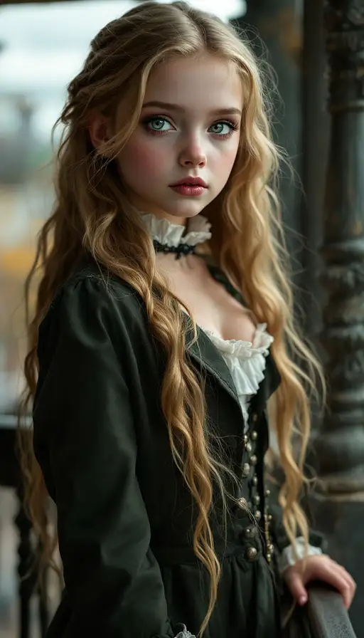 A photo realistic of a exceptionally beautiful Saudi (age 11) girl, long hair, in a pony tail, dressed as a prisoner of war, old ragged mismatched cloths, standing in a Ira professional photo of a eleven year old vampire girl (Sara Howard), (futuristic),(masterpiece), (realistic), (perfect anatomy) with long blonde hair large beautiful brilliant Forest Tea red-green-blue-pink-silver-brown-golden eyes,, sitting on beautifully decorated 1800's train, dressed in the fashion The Vampire Diaries church priestess (8k), (high res),ultra-detailed, photo-realistic, front view, highly detailed, volumetric, dramatic light Perfect graphics, ultra-detailed, photo-realistic, full image view, full body view, front view