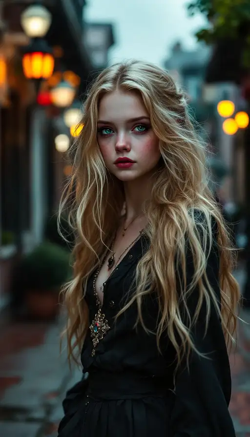 a professional photo of a eleven year old vampire girl (Sara Howard), (futuristic),(masterpiece), (realistic), (perfect anatomy) with long blonde hair large beautiful brilliant Forest Tea red-green-blue-pink-silver-brown-golden eyes,, sitting on beautifully decorated 1800's train, at night lite on by oil lamps, all the shade are closed dressed in the fashion The Vampire Diaries, (8k), (high res),ultra-detailed, photo-realistic, front view, highly detailed, volumetric, dramatic light Perfect graphics, ultra-detailed, photo-realistic, full image view, full body view, front view