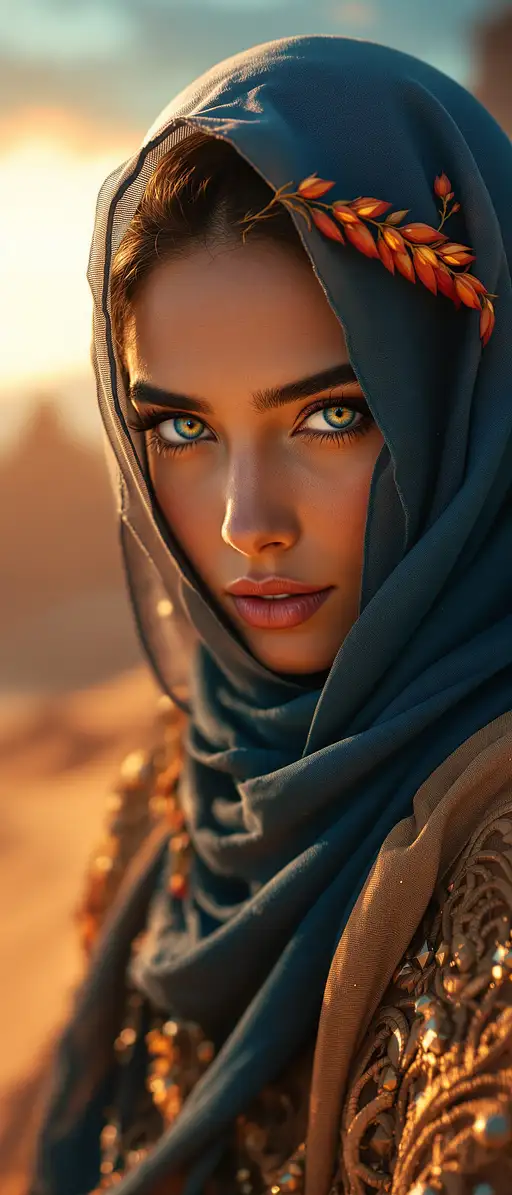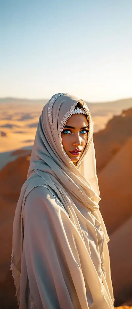 15 hours ago "High definition full-height vertical photography of an Arabian woman. with vibrant blue eyes, veiled and poised on a desert precipice. Warm golden hour light, cinematic drama enhance the atmospheric scene. Vibrant complimentary colours, soft light, film style composition." PY2K66 PRO 1 4
