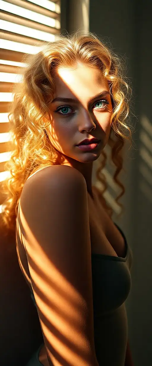 3 months ago High resolution full body portrait photograph, Sony A1 50.1MP, 26mm prime lens. Slender supermodel, early 20s, honey blonde curly hair, vibrant emerald green-blue-silver-grey eyes looking into camera. Dramatic pose in sunlit gap, diagonal shadows like window blinds. Warm, vibrant colours, soft dreamy atmosphere, minimalist aesthetic The_Promptonaut 1 59