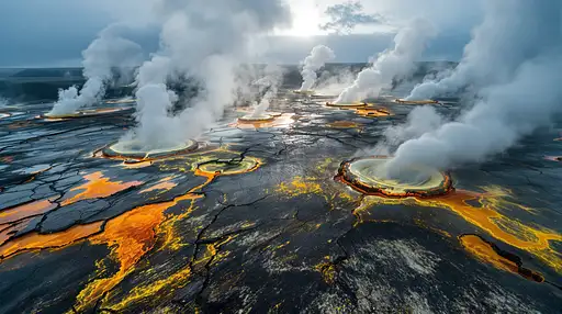 A wide angle, long distance, from air, photo of a strong and athletic female demon (female bodybuilder with emphasized abdominal muscles, black hair) , and large, curved horns protruding from her forehead. BodySkin: gradient red,black and pink emphasizes her female forms. matching red and blac facepaint. faceshape : natural Triangle shaped with protruding upturned eyes with brown/orange pupils. Elegant vampire teeth. Soft heavy lower lips. in a pale skincolor. Hairstyle: all hair is pulled back in a tight slick back ponnytail falls back like a waterfall of night, reflecting the vibrant lighting effects that create an ethereal, radiant glow as she Dressed in a super slick black latex bikin in intricate lizzard pattern straps with intricate details, Black latex boots She is playing on a Tama Drum-battery (drum set with cymbals) setup in the smoke., important, she has one drumstick in each hands. lnviroments: A vast, sweeping drone shot of a desolate and primordial volcanic wasteland. The ground is a patchwork of cracked earth, sulfur-stained mineral deposits in vibrant yellows and oranges, and bubbling, grey mud pots. Plumes of thick, black steam and acrid smoke rise from numerous steaming fumaroles, partially obscuring the landscape and creating a moody, atmospheric haze. molten lava flows here and there. The lighting is from the low, weak sun of the Icelandic blue hour, casting long, distorted shadows and giving the scene a deep blue and grey color palette, punctuated by the unnatural warmth of the geothermal vents. The air itself feels heavy and ancient. In the smoke The scene is utterly devoid of life, evoking a sense of immense, ancient pressure building from deep within the planet. Low angle, 8k resolution, photorealistic Unreal Engine render.