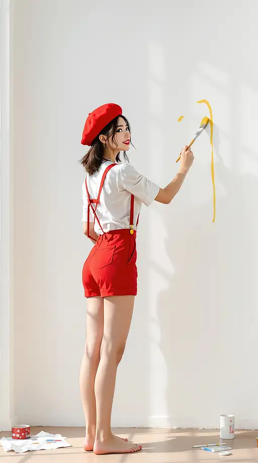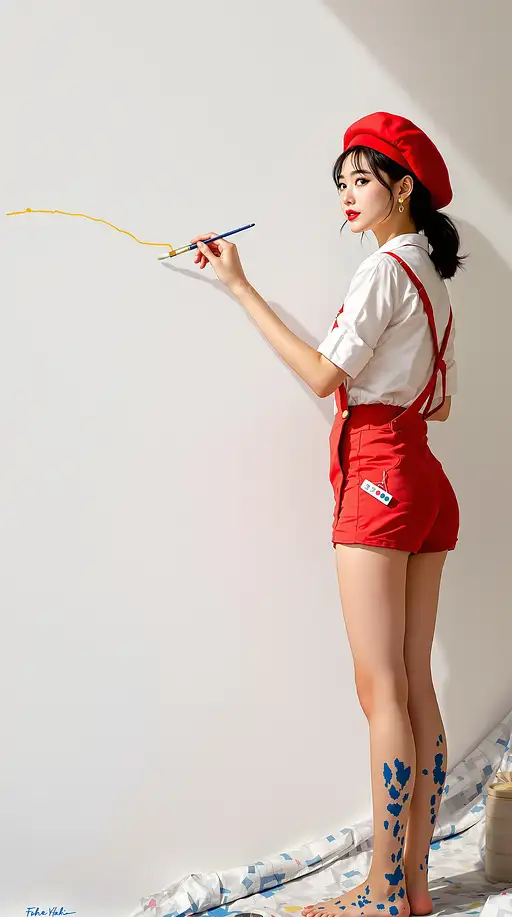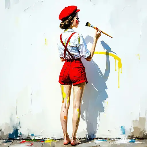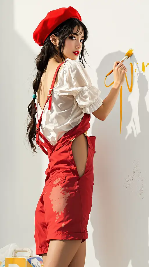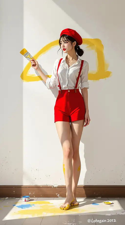 Full body view of a Woman (Ethnicity: 1.0), (Age: 20), (Clothing Details: 1.2), (Accessories: 1.2), (Facial Features: 1.3), (Expression: 1.2), (Body Type: 1.2), (Pose: 1.2) wearing a red beret, a white blouse and red shorts with suspenders, painting a white wall with a brush drawing a big blue eye, detailed hair and eyebrows, fair and bright skin stained with yellow and blue color spots, delicate makeup with red lips, slim body, bare feet, beautiful feet only 5 toes on each foot, show foot, natural light, comic style, digital painting, photorealistic skin texture, 3/4 view, (Detailed Clothing Folds: 1.1), bright colors and soft lighting, strong shadows, thin wall texture, elegant, comic art, upper body slightly leaning towards the wall, slightly posing; Artistic style, highly detailed illustration, hyper-realistic style, detailed shading, realistic background.