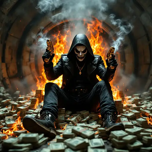 6 months ago a crazy character wearing a sinister looking face mask where you can see facial features, black leather coat, black jeans and timberland boots, black gloves holding smoking gold guns with the smoke making $ signs made of smoke and is sitting on a pile of money, stacks of cash bundled with $10,000 bands around them all on fire and behind him on an decayed abstract bank vault wall , cinematic, hyper realism, high detail, 3d illustration, 8k MKAOS PRO 1 9