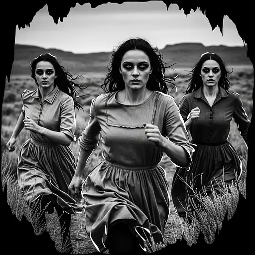 8 months ago black and white photograph of women running, in the style of intense gaze, hauntingly beautiful, richly layered, expressive eyes, jagged edges, western-style portraits, loose and fluid style --ar 73:111 --stylize 750 --v 6 2CentsMaker PRO 0 78