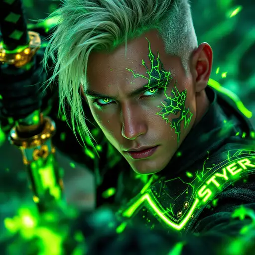 5 months ago Editorial Vivienne Tam photography of a gothic punk rebel lloyd garmadon with neon green and black accents on his suit and glowing tattoos, wielding a katana (yellow and black), close-up, in the style of anime art, expressive textural quality, photo-realistic techniques, vibrant colorful palette, hurufiyya, 32k UHD, fluid dynamic brushwork, realistic hyper-detailed portrait, sharp angles, hard-edged painting, ukiyo-e style altair 0 35