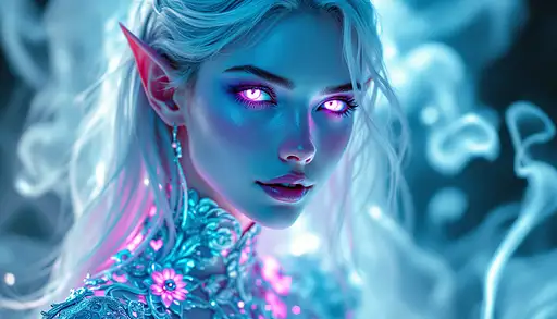 Close-up portrait of a young, white shiny-skinned female figure, with striking, glowing magenta eyes and a subtle smile. Intricate, ornate, metallic, white-blue clothes for elfs covers the figure's entire body, featuring detailed lace-like patterns and glowing neon-pink accents. The clothes has a sculpted, form-fitting design, highlighting the figure's physique. elf ears The hair is shoulder-length, flowing, and pale white. The lighting is dramatic, with strong blue and green illumination highlighting the figure's face and elaborate clothesr, creating a striking contrast with darker shadows. A soft focus effect emphasizes the figure's face and glowing eyes. The background is out-of-focus, consisting of soft, flowing,white-blue and white shapes that evoke a smoky or ethereal atmosphere. The overall style is a blend of fantasy, anime, and futuristic elements, creating a unique and compelling visual narrative. Ultra detailed, highly stylized, digital illustration, dramatic lighting, glowing eyes, gothic, cyberpunk, glowing neon light, anime style, hyperrealistic, 8k. --ar 1:1. 5 --q 2 --s 750