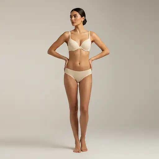"A hyper-realistic, ultra-detailed full-body depiction of the same woman (173 cm) with a tall, well-proportioned body and natural bust. She is standing casually with her hands resting on her hips, looking slightly to the side. Her entire body, from head to toe, is fully visible in the frame without any cropping or cut-off areas. She is dressed in a matching color bra and thong that seamlessly blends with the scene, ensuring no color conflict with the neutral background. Her long, well-proportioned legs are fully visible, emphasizing their natural shape and symmetry. She has Indian ethnicity with warm undertone white skin, an oval face with high cheekbones, full lips, and a softly defined jawline. Her deep brown eyes and symmetrical facial proportions enhance her natural beauty. She wears no makeup. Her dark brown hair is styled in a sleek low bun with a center parting, ensuring her consistent facial structure is maintained across variations. The soft, natural lighting enhances depth and realism. She stands in a full-body, head-to-toe, wide-framed, front-facing standing pose, ensuring that her entire body, including her feet, is fully within the frame. The image is shot at a true full-body distance with a wide-angle lens, neutral perspective, and correct proportions, preventing any cropping of legs or feet. The camera captures her entire height in a straight-on, wide-framed composition. The background is a simple, neutral gradient, keeping the focus on her. HDR 4K, ultra-detailed textures, extreme photorealism, cinematic quality."