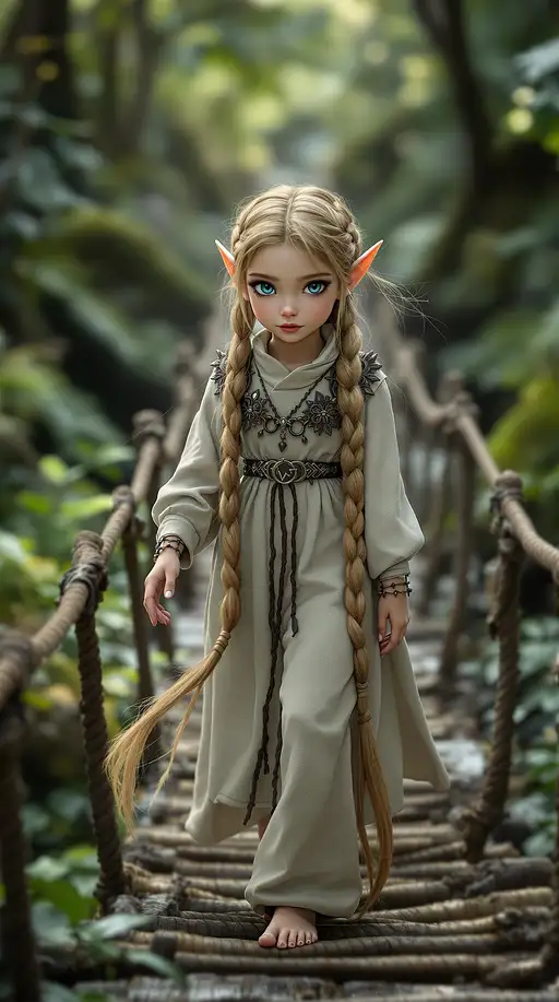 djrny-v4 style, score_13, score_28_up, score_37_up, a professional realistic photo of a (ten year old) most beautiful short eared elf girl in the world, in a highly detailed, (age appropriate anatomy), (masterpiece), (realistic), (viewing full body), (facing the viewer) with extra long, extremely long thick chestnut blonde hair rope braid, beautifully flawless olive skin, thick black eye liner, extra long eye lashes, light pink blush, extremely beautifully shaped lips with light pink lipstick, black eye shadow, beautiful perfect high cheekbones beautiful perfect high cheekbones extremely detailed perfectly shaped beautiful brilliant Forest Tea blue-golden-grey-purple eyes, beautifully manicured fingernail with pink polish, dressed in style the hobbit blood elf queen, crossing a old wood, rope bridge over a valley in a forest , magical, mystical, high depth of field, agitated expression, created with Unreal Engine 5 and Octane Render, high resolution photography, intricate details, ultra-sharp focus. --v 6.1 (best quality, 8k,high res,masterpiece:1.2),ultra-detailed, (realistic, photo realistic, photo-realistic:1.37), (high res),ultra-detailed, photo-realistic, front view, highly detailed, volumetric, dramatic light Perfect graphics, ultra-detailed, photo-realistic, full image view, full body view, front view