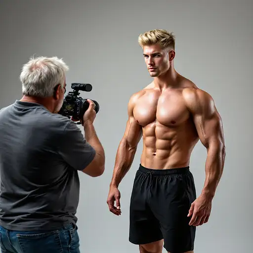 6 months ago high-resolution photo, muscular, handsome young man with light blonde hair wearing gym shorts, standing in photo studio, fat old man photographing him, photorealistic, UHD, shot on a Sony A7III, optimal photography, natural lighting mrpeenee PRO 0 25