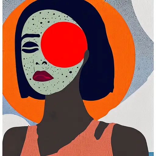 over 1 year ago a painting of a woman's face with a city in the background, poster art, by Zoran Mušič, pexels contest winner, afrofuturism, huge red moon, big moon above the water, josan gonzales, ruins sg3103 1 96