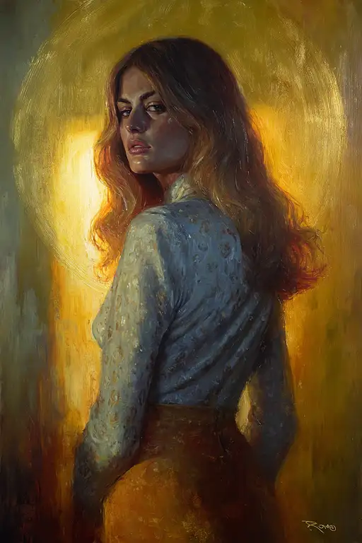 5 months ago a painting of a woman, in the style of brushstroke-intensive portraits, cinematic elegance, golden light, flowing brushwork, multilayered realism, feminine themes --ar 2:3 --exp 50 --profile dafs194 --weird 500 sg3103 0 25
