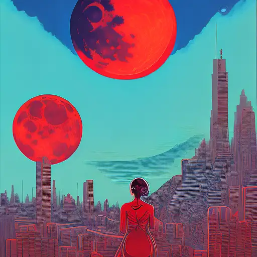 over 1 year ago a painting of a woman's face with a city in the background, poster art, by Zoran Mušič, pexels contest winner, afrofuturism, huge red moon, big moon above the water, josan gonzales, ruins sg3103 0 64