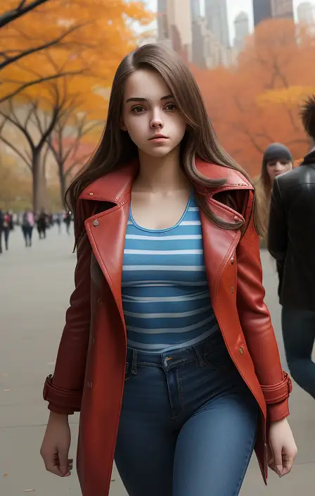 almost 2 years ago beautiful teenage girl in blue jeans, striped tank top and red leather coat, walking in Central Park New York sg3103 0 68