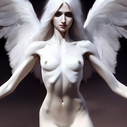 emale angel, long legs, white wide wings, long dark hair, sword in hand, ((detailed face)), ((detailed eyes)), ((detailed full body)), big breast, masterpiece, best quality, realistic, real_life photo, soft lighting, natural lighting, by roberto ferri, artsation
