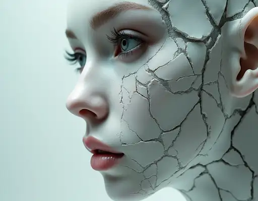 beautiful humanoid woman, close-up of broken android, digital art, cracked porcelain face, futuristic look, mesmerizing, close-up, fragile, emotional, shatter, broken glass, shards, of porcelain, broken, shattered, abstract patterns, tile art, roses, portrait photography, cinematic, white and light gray, shallow depth of field - no ugliness, art, paint, digital, monochrome, artifacts watercolor, airbrushing