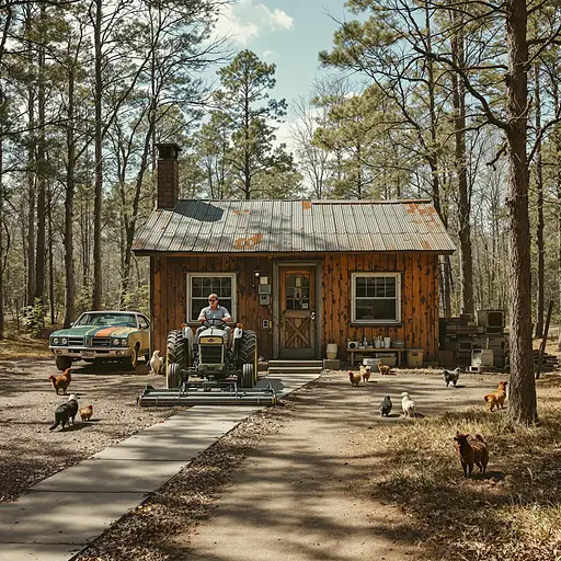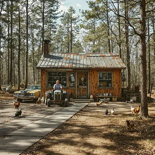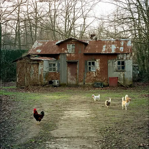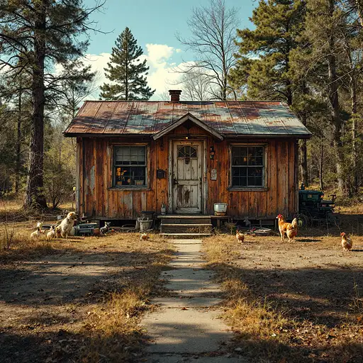 Throughout the yard, scattered haphazardly, are relics from a bygone era: old cars, once reliable, now left to rust and decay, remnants of appliances that have long since served their purpose. These artifacts enhance the nostalgic aura enveloping the property, harking back to a time when they were the symbols of modern convenience.