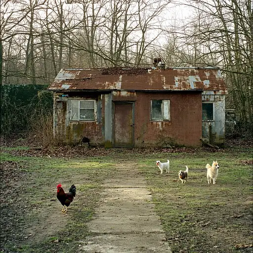 Roaming freely, paying no heed to the passing time, are dogs, cats, and chickens. They wander the expanse, adding life and movement to the otherwise stagnant scene. The entire tableau exudes a late 70s country atmosphere, a symphony of simplicity, resilience, and bygone charm.