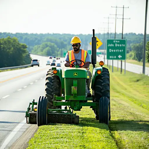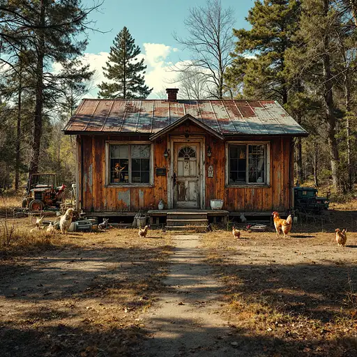 Please create a cinematic photo of a rustic plywood shack nestled in the woods, featuring a tin roof, front door with large windows on either side, and additional window on the edge of the house. The shack should be depicted with brown stained plywood, mildew, and mold, while the roof should appear rusted and dirty. The front yard should be dirt with a concrete walkway leading from a dirt driveway to the front door, and there should be old cars and appliances scattered in the yard. Furthermore, the scene should include dogs, cats, and chickens roaming around, evoking a late 70s country atmosphere. Please ensure the photo is in 16:9 aspect ratio and has a stylized effect with a value of 750. Please note that the photo should capture the rustic and nostalgic ambiance of the setting, reflecting the details mentioned above in a visually compelling manner. Please ensure that the picture captures the sunny atmosphere, the vintage tractor mowing the median, and the details of the driver's appearance, while maintaining a realistic and visually appealing composition.