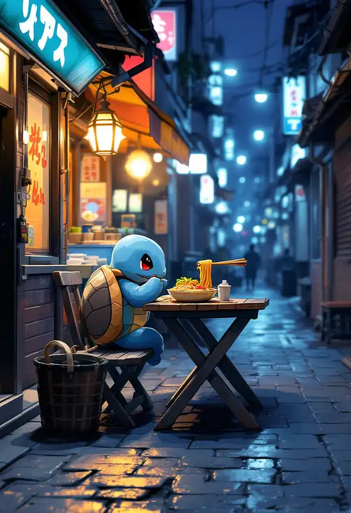 The image depicts a cartoon Squirtle from the Pokémon franchise sitting at a table in front of a Japanese-style restaurant, enjoying a bowl of noodles. The scene is set in a bustling street with a sign above the restaurant featuring Japanese characters and the word "Tonkotsu" in English. * **Squirtle** * Squirtle is a blue turtle-like Pokémon with a large head, small eyes, and a long tail. * It has a distinctive shell on its back and is depicted in a cartoonish style. * Squirtle is sitting at a table, facing the viewer, and holding a pair of chopsticks in its right hand. * It is eating a bowl of noodles, which is placed in front of it on the table. * **Restaurant Background** * The restaurant has a traditional Japanese-style exterior with a wooden facade and a tiled roof. * There are several signs and banners hanging above the entrance, including one that reads "Tonkotsu" in English. * The interior of the restaurant is not visible, but it appears to be a cozy and intimate setting. * **Street Scene** * The street outside the restaurant is narrow and winding, with several other buildings and shops visible in the background. * The street is lined with trees and has a few pedestrians walking along it. * The overall atmosphere of the image is one of warmth and
