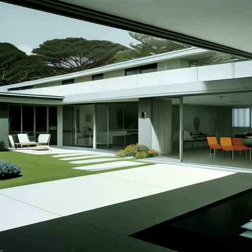 2 years ago Hyper realistic eye level exterior photo of a mid century modern style house overlooking the ocean, daylight, indirect lighting, AD magazine, Frank Lloyd, Eames, Mies van der Rohe toqeer 0 39