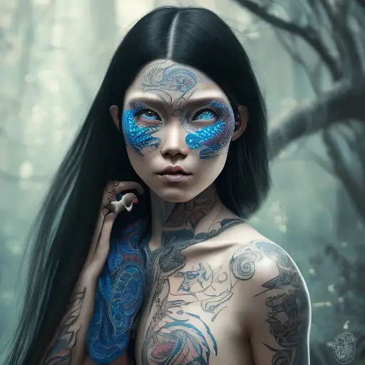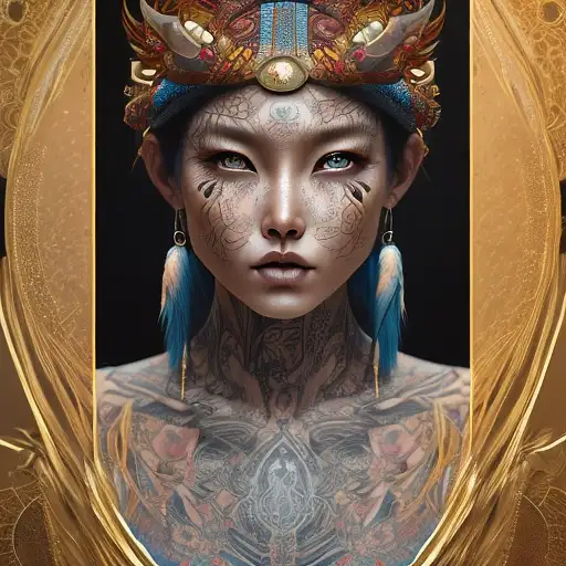 hyper realistic photograph, portrait of a tattooed asien indigenous woman with BLUE eyes and BLACK hair, urban fantasy, sharp focus, intricate, elegant, digital painting, 3d render, artstation, matte, gold, highly detailed, concept art, illustration, ambient lighting, natural lighting, octane render, unreal engine 5, 100mm, trending on artstation, 8 k, concept art, intricate details, future punk, gold tattoo line, side profile, winter, dramatic light, looking down film grain, Leica 50mm, Kodak portra 800, chiaroscuro, f1.4, golden hour —ar 3:4 —test --upbeta highly detailed, photorealistic, studio quality, arnold render, octane render, 8 k, unreal engine, raytracing, cgi, cgsociety, artgerm, by rutkowski