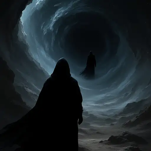 11 months ago concept art a black being in the void in the background, starring back at the cloaked person in the foreground, academic art , 8K resolution, renaissance painting(0.6), digital illustration willgreyy 0 45