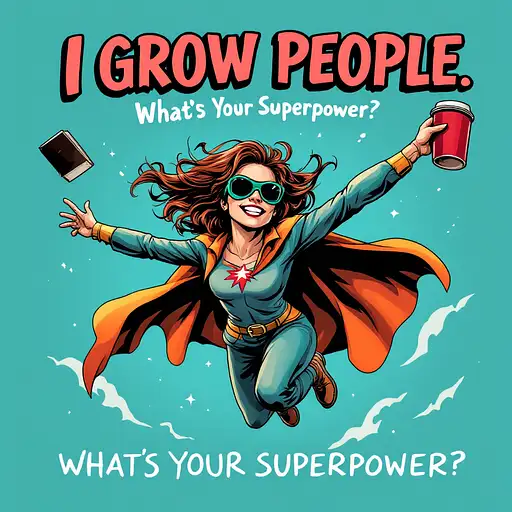6 months ago A dynamic, comic-style female superhero flying with books in one hand and a coffee mug in the other. The text says: ‘I Grow People. What’s Your Superpower?’ in bold, action-movie style letters." wiltheron 0 24