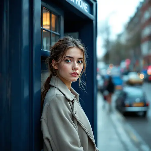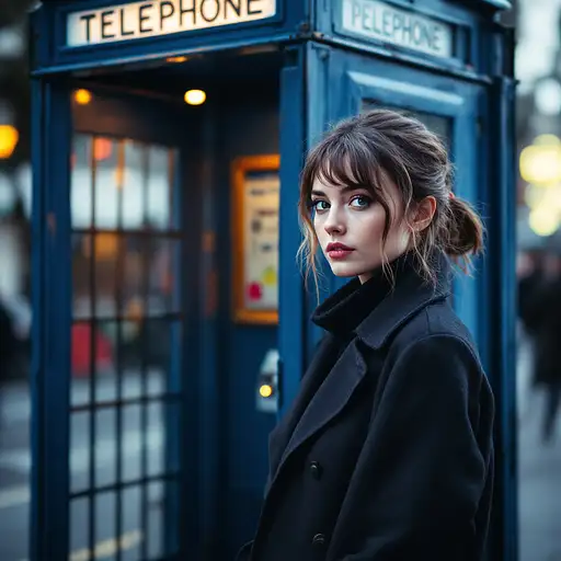 10 months ago Dr.WHO ,pertty young female,she is 30year old, she is stand next totelephone booth ,60s british police telephone booth, the color is bule and door is open, the background is in the street.and photograph taken with a 25mm lens in the style of Derin. --ar 45:64 --v 5. 2 yauyau 1 24