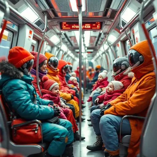 10 months ago Futuristic , highly detailed, A subway car with a very few passengers. the passengers are dressed in far futurist very colorful vivid winter clothing and they are cheerful, nice faces. half of the passengers are nice cyborgs. and baby cyborgs are on their laps.The interior of the subway car is far futurist. The overhead handrail is polished, and the floor appears to be made of metal. The overall ambiance of the image evokes a sensense of futuristic. photography yauyau 1 48