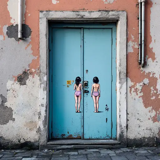 10 months ago Realistic graffiti of two girls painted from behind onto an old door that has been opened, in the style of Banksy, pastel blue and pink striped swimsuits --ar 99:91 --stylize 750 yauyau 1 29