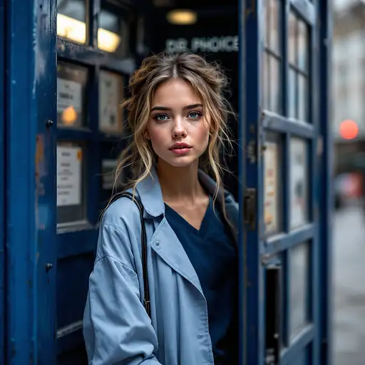 10 months ago Dr.WHO ,pertty young female,she is 30year old, she is stand next to ,60s british police telephone booth, the color is bule and door is open, the background is in the street.and photograph taken with a 25mm lens in the style of Derin. --ar 45:64 --v 5. 2 yauyau 1 27