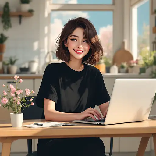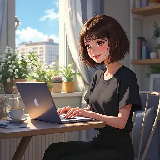1girl, happy, very closeup painting, short feathered hair, best brown girl hair, pretty woman typing on a laptop, laptop, desk, chair, laptop on desk, coffee, apartment, spring, indoors, windows, other parts of home, clear sky, cute, black t-shirt, black pants, aesthetic. (best quality:1. 2), animated lighting, octane render, bright mood, fashion, anime, masterpiece, trending, detailed fanart, anime faces, realism