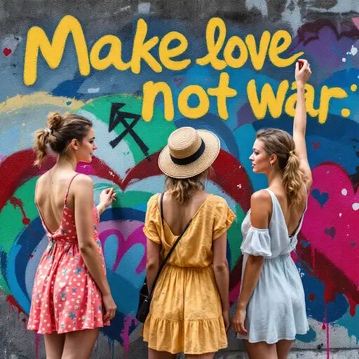 10 months ago Berliner Wall, ,3 woman protest in short summerdress ,"Make love, not war",coloured,paint grafitti on the wall yauyau 1 32