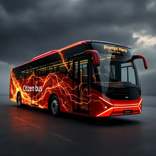10 months ago High resolution photography bus, a sleek and modern design with a red and yellow color scheme representing the fire and lightning ,Incorporate an outline of the bus and elements symbolizing natural beauty, such as clound and thunder. The text "PromptHero Citizen bus" is stylishly integrated into the design, elegantly included, yauyau 0 12