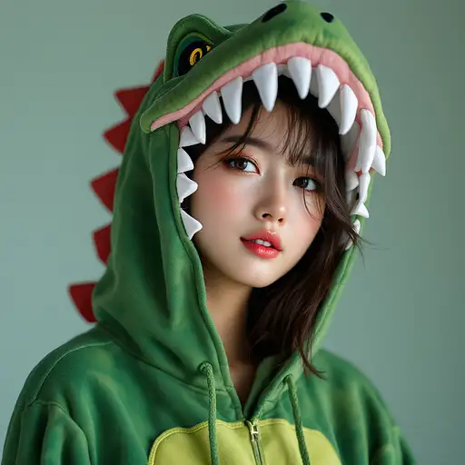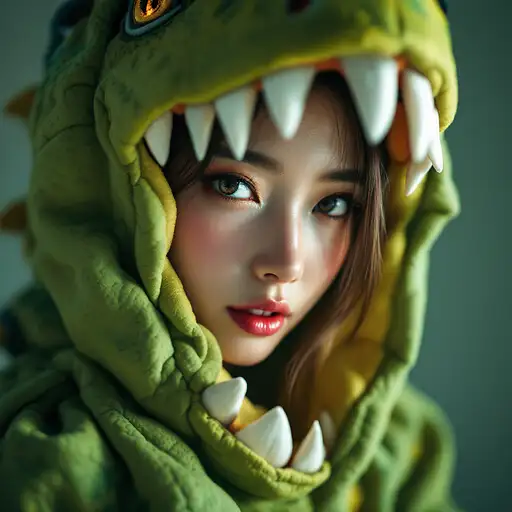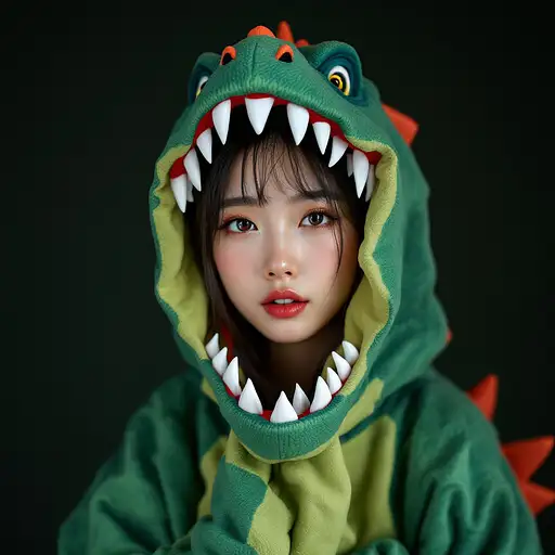 10 months ago beautiful female k-pop idol wearing a cute dinosaur costume, her face is visible:: close up portait, shot on sony a1, 85mm F/1.4 ISO 100, medium format, 45 megapixel, studio lighting, softbox, high shutter speed flash photography, award winning photograph with golden ratio composition --testp --ar 2:3 --seed 1661 --creative --stylize 2600 --upbeta yauyau 1 16